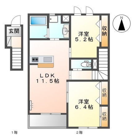 間取り詳細 | LDK 11.5畳 、 洋室 5.2畳 、 洋室 6.4畳 |