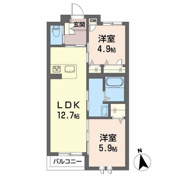 | 間取り詳細 | LDK 12.7畳 、 洋室 4.9畳 、 洋室 5.9畳 |