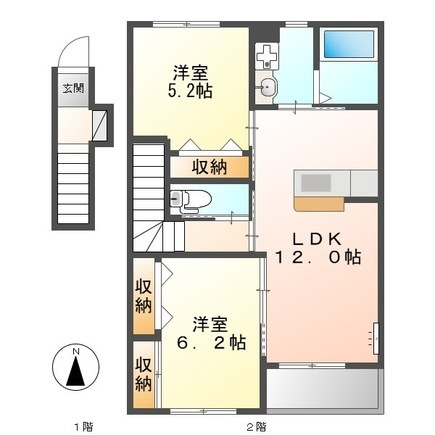 | 間取り詳細 | LDK 12畳 、 洋室 5.2畳 、 洋室 6.2畳 |