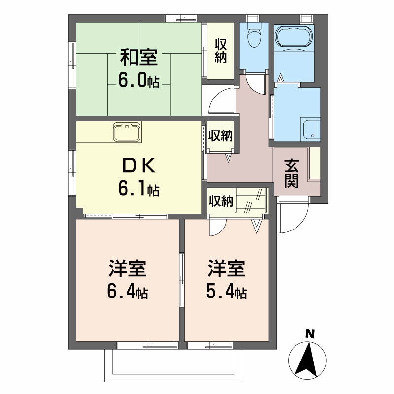 | 間取り詳細 | DK 6.1畳 、 和室 6畳 、 洋室 5.4畳 、 洋室 6.4畳 |